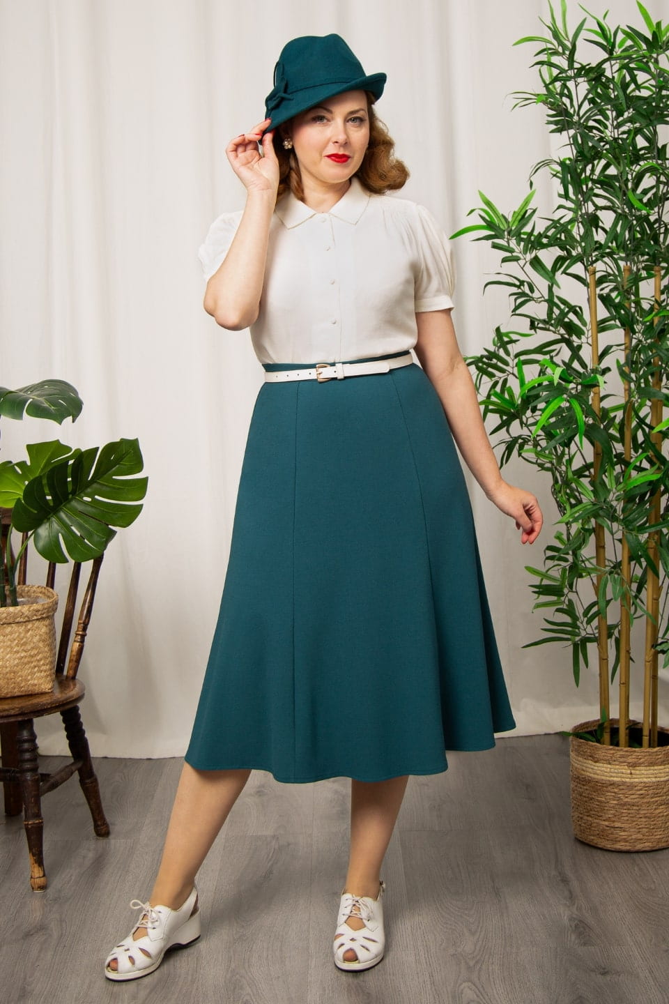 Our Bette midi skirt is inspired by the glamorous 1930s. It is a super feminine, yet practical item for the modern woman, whether she is wearing it to work or an evening out.  Made from a gorgeous heavy crepe fabric which provides a little stretch ( the same as our beloved Classic 1940s style A-line skirt), the skirt fits around the hip and flares slightly towards the hem, draping beautifully to give a beautiful petal-like shape to the skirt. The skirt falls just below the knee to create a unique vintage elegance and is half-lined to prevent clinging around your tummy and upper thigh, allowing the skirt to move with you. Fastening with a simple zipper and button, style and practicality go hand in hand. This is a classic skirt and a stunning addition to your vintage-inspired wardrobe.