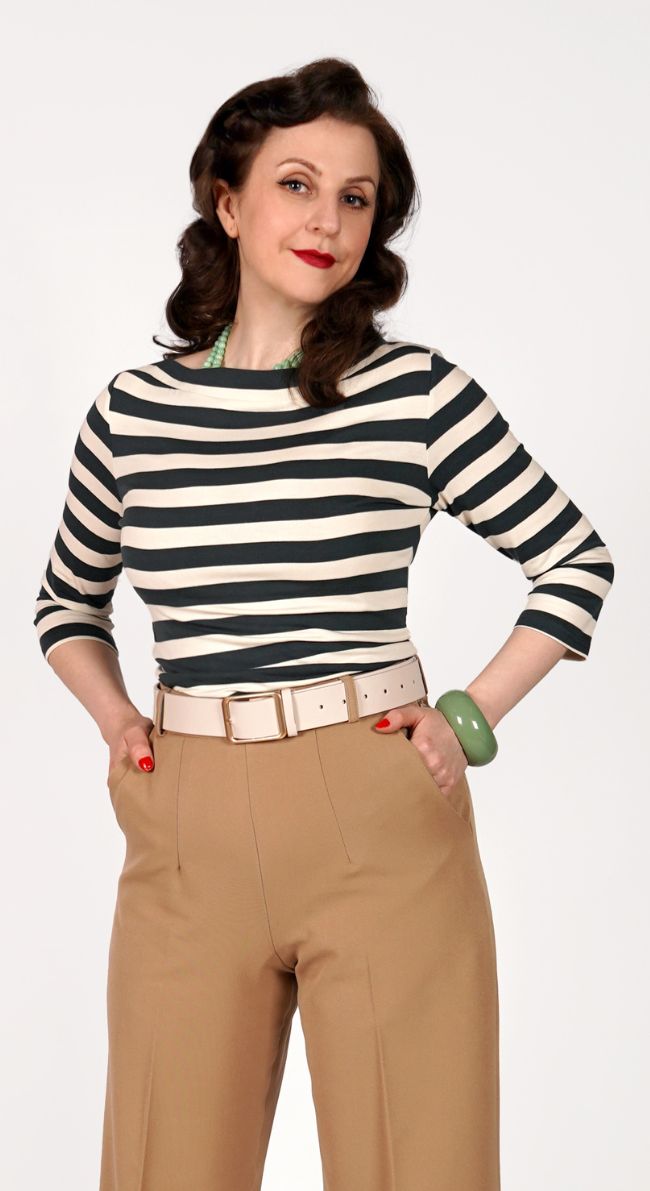 Our flattering slash neck three-quarter sleeve Janet Top is crafted from a soft viscose striped jersey, which offers stretch and comfort. You can pair it with our high-waisted trousers or skirt to complete a natural retro look. This classic and versatile top is a limited edition item due to fabric availability. It’s made in London, supporting small businesses.