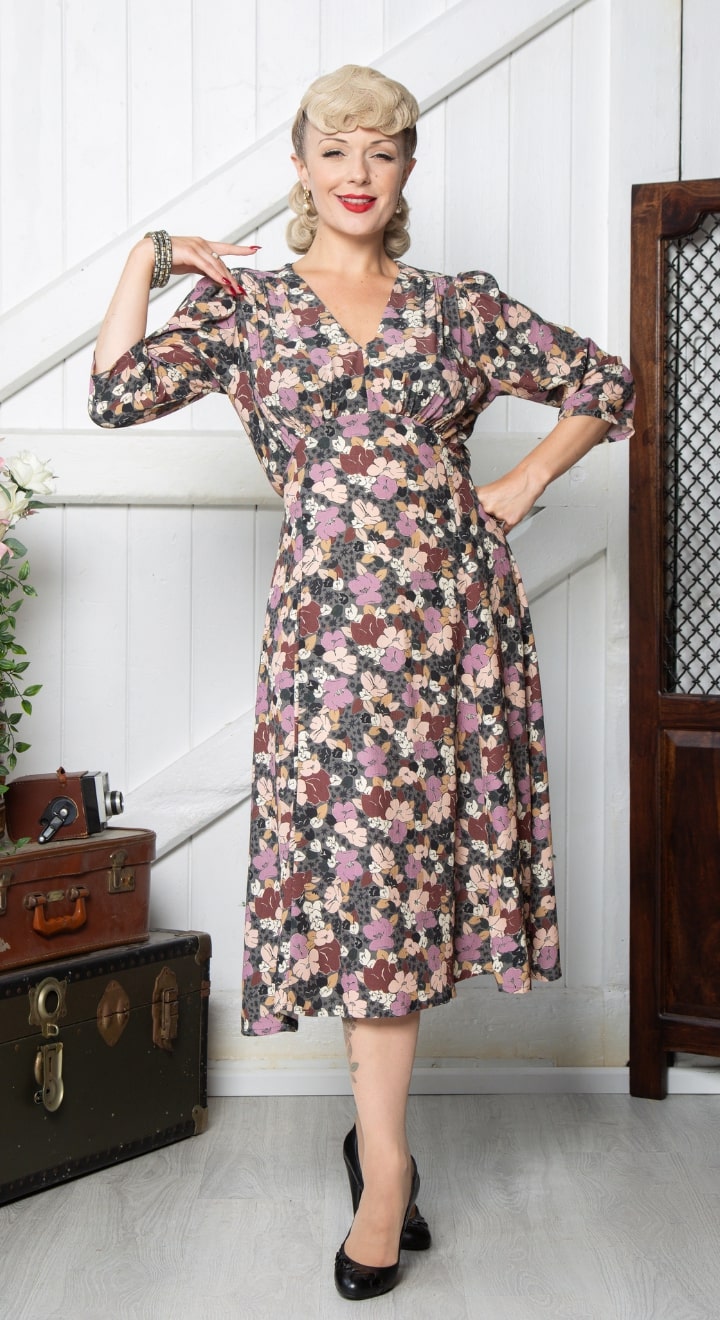 Vintage Inspired Grey Floral Print Knee Length Tea Dress | 1930s & 1940s Style | Weekend Doll