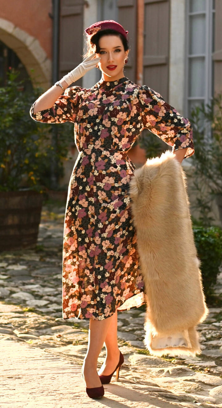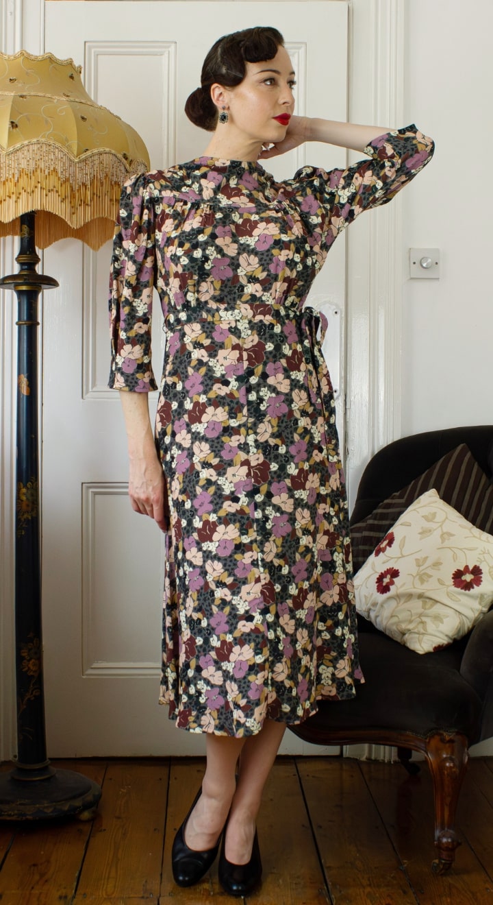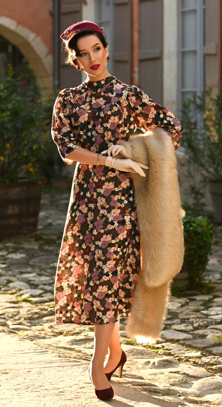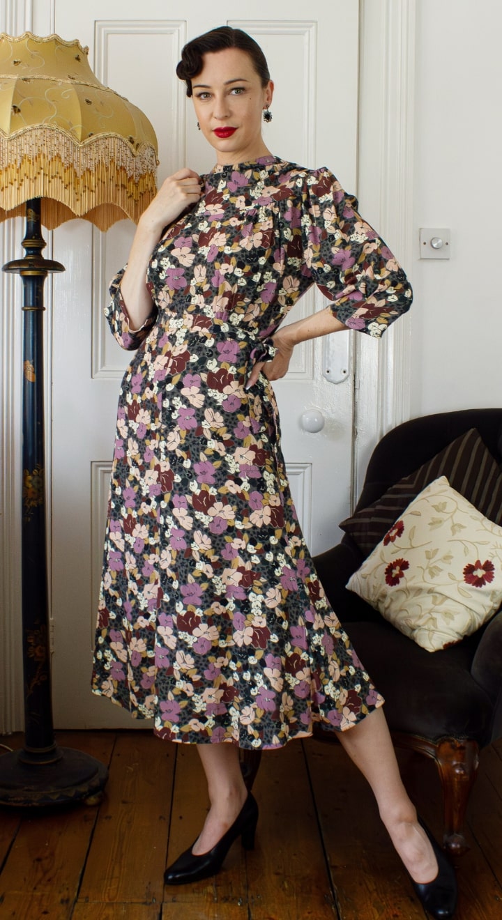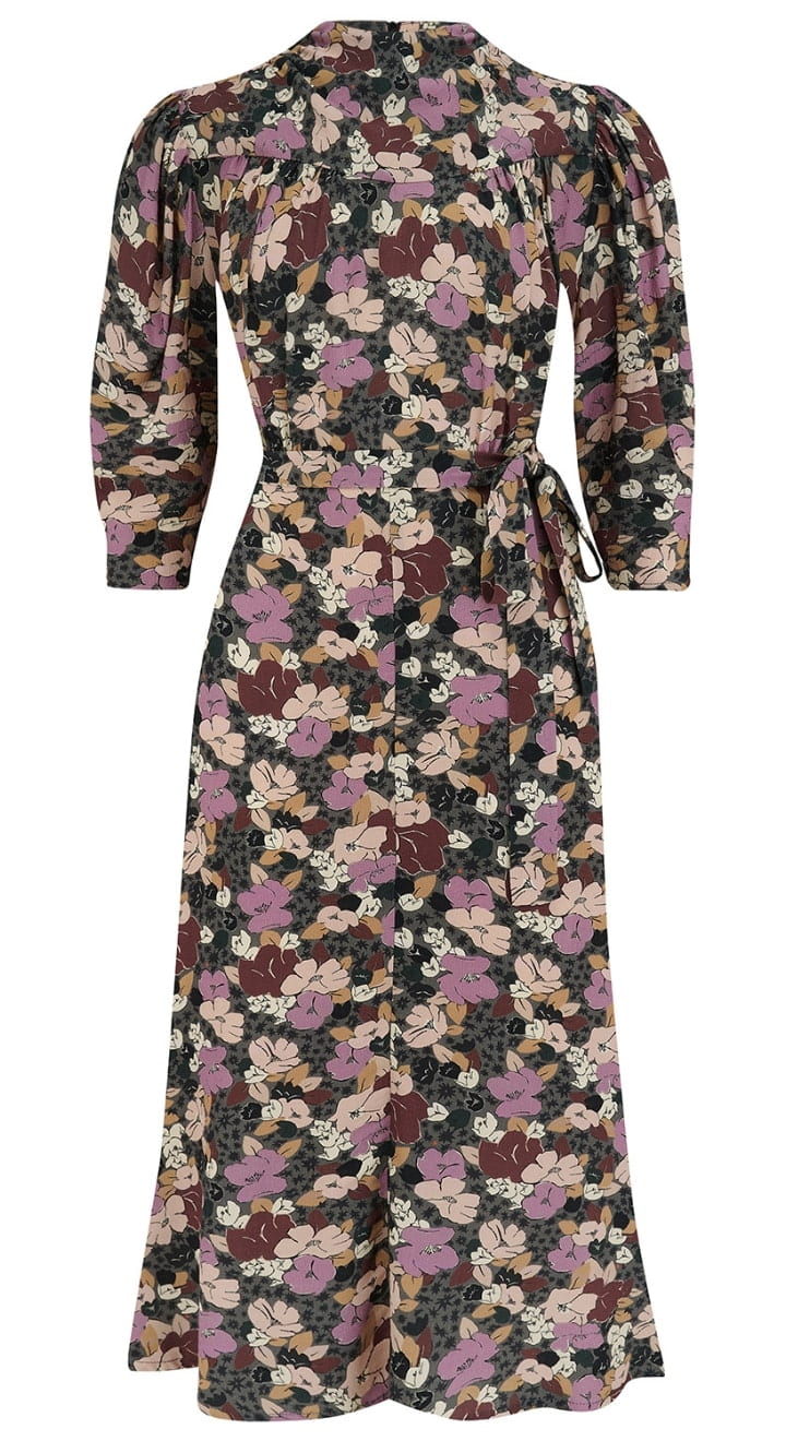 Crafted from stunning, sustainably sourced viscose in an equally beautiful original print, our Rita dress is inspired by the 1930s and 40s, with its high neckline and fabulously flattering skirt. To create a slight drape, the front panel has been cut on the bias creating a fluid, waterfall hem in unique gathered waves. This allows for perfect movement with every step and flow of the dress. The skillfully constructed neckline is all down to the effort and time that went into perfecting the gathered bust and three-quarter length, tucked sleeves. The skirt, which is expertly half-lined, has a floaty and feminine silhouette, falling beautifully below the knee. The Rita dress is the latest addition to our collection of sustainable viscose garments and a guaranteed wardrobe staple for all you vintage lovers.